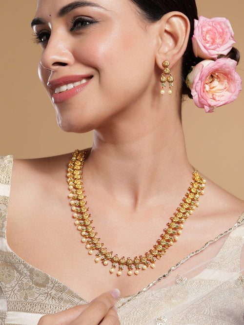 Necklace Set : Discover elegance with the Gold-Plated design, meticulously crafted for those who cherish luxury. This piece features Ruby and Emerald stones for an eye-catching sparkle, making it perfect for special occasions. With a blend of high-quality materials and exquisite design, it promises both durability and style. The versatile look can complement a variety of outfits, adding a touch of sophistication. A must-have for enhancing your accessory collection with timeless elegance.