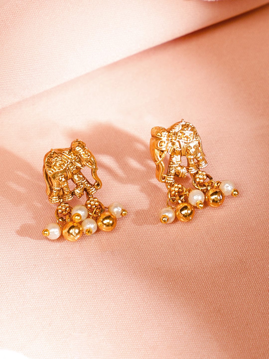 Jewellery Set : This 22K gold-plated temple necklace set features a divine ganesh motif, ruby and emerald stone accents, and pearl beaded drops with earrings—perfect for women & girls for festive and wedding looks.