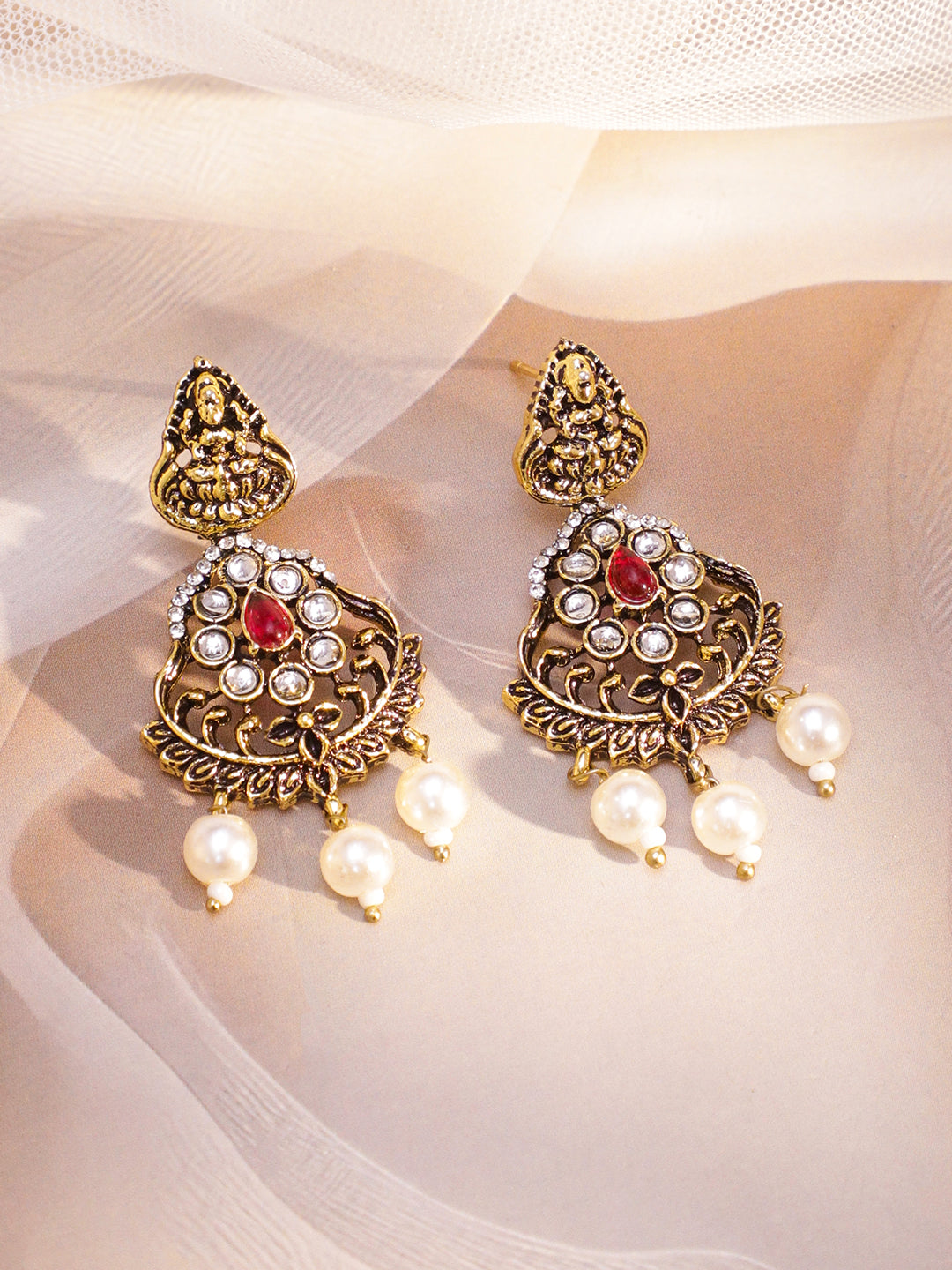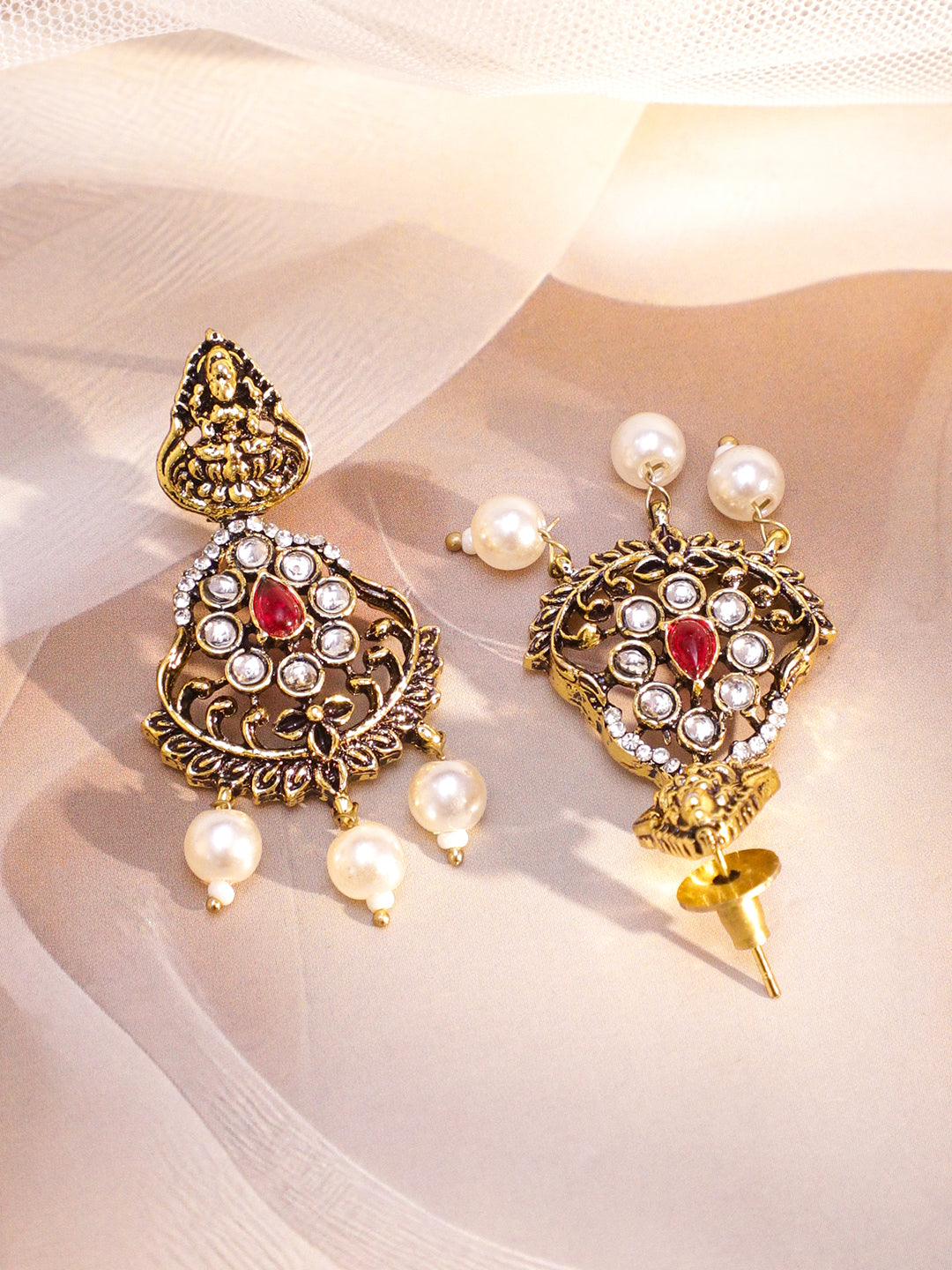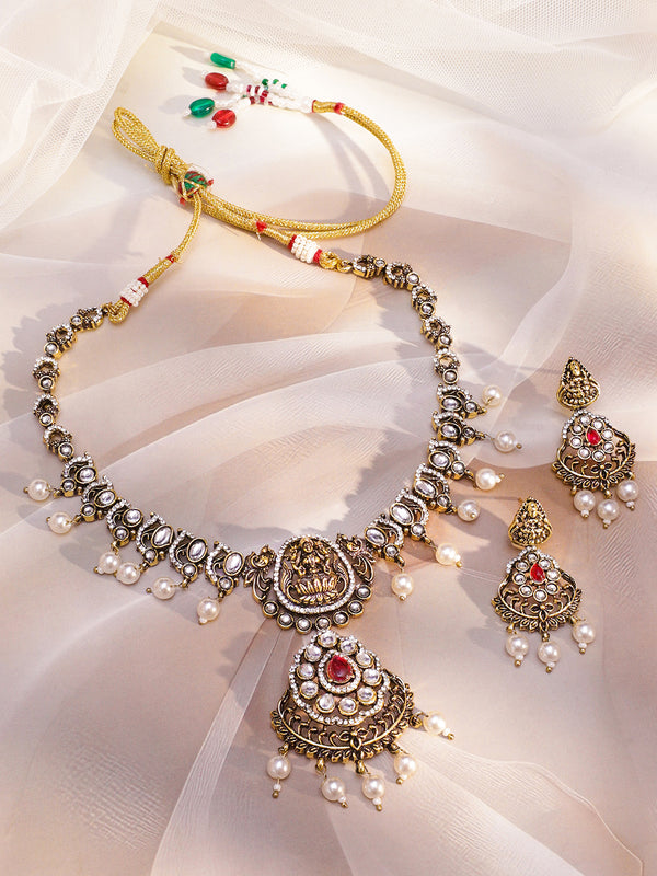 Jewellery Set : Rubans 22K Antique Gold-Plated temple necklace set with divine Lakshmi motif, cubic zirconia studded detailing and pearl drops, perfect for weddings, festive and cultural occasions.