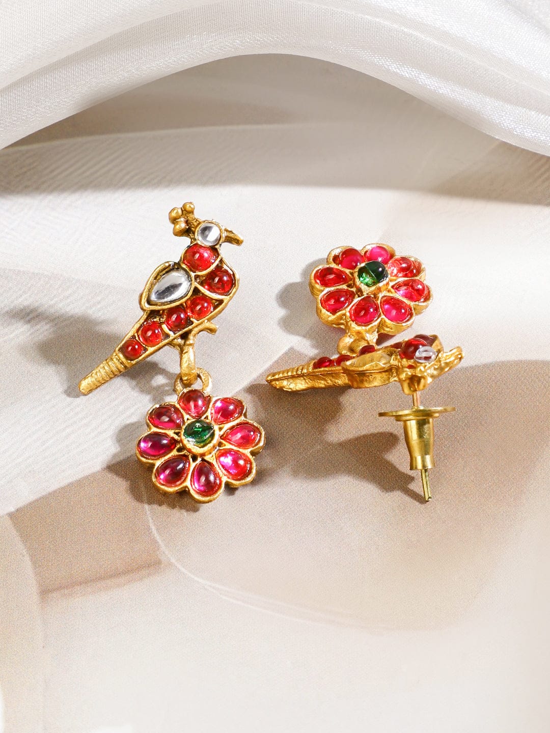 This 22K gold-plated temple jewellery set features a divine Lord Balaji motif on a multi-layer mesh choker, adorned with ruby red and green stones. Paired with floral dangler earrings, it’s perfect for women & girls to wear at weddings and traditional festivities.