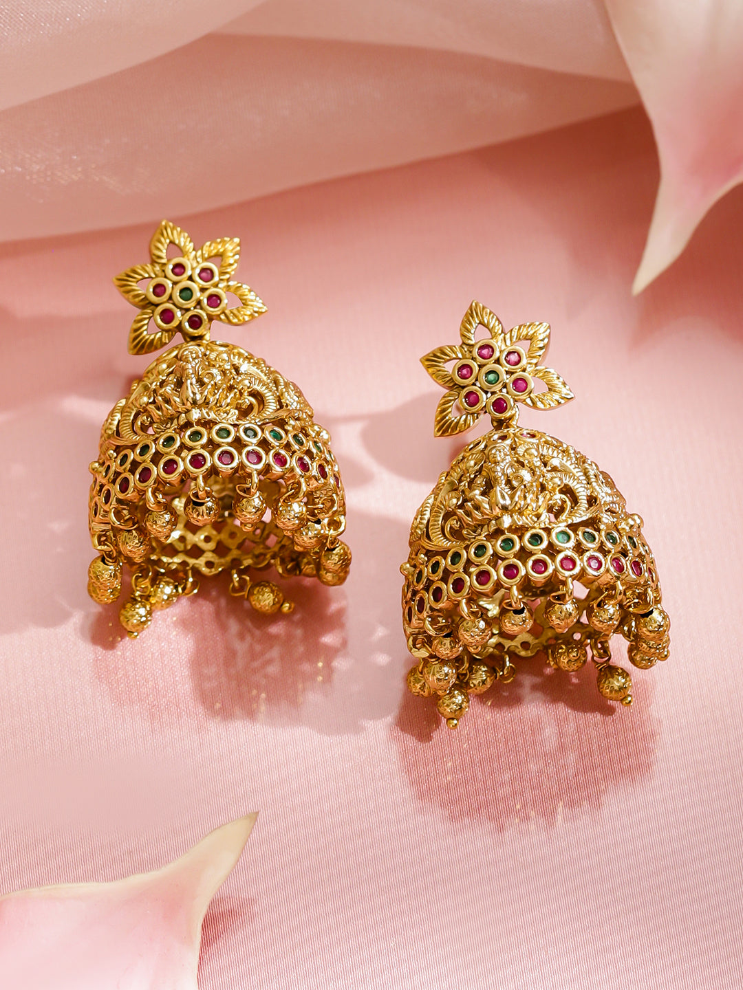 Necklace Set : This 24K gold-plated royal heritage temple choker set features red and green stones with pearl drops, blending divine craftsmanship with timeless grandeur.