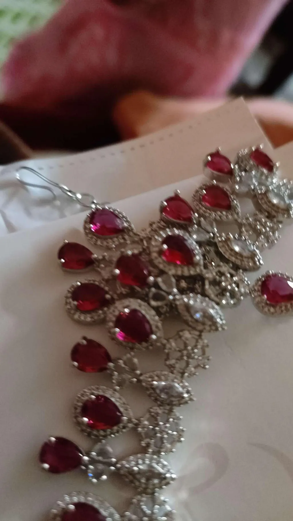 Jewellery Set : Exude elegance with this rhodium-plated necklace set, adorned with stunning ruby red teardrop stones and sparkling white cubic zirconia. The intricately designed necklace beautifully complements the matching earrings, making this set perfect for adding a touch of luxury to your evening attire. Ideal for those special moments, this set is a timeless addition to your jewelry collection.