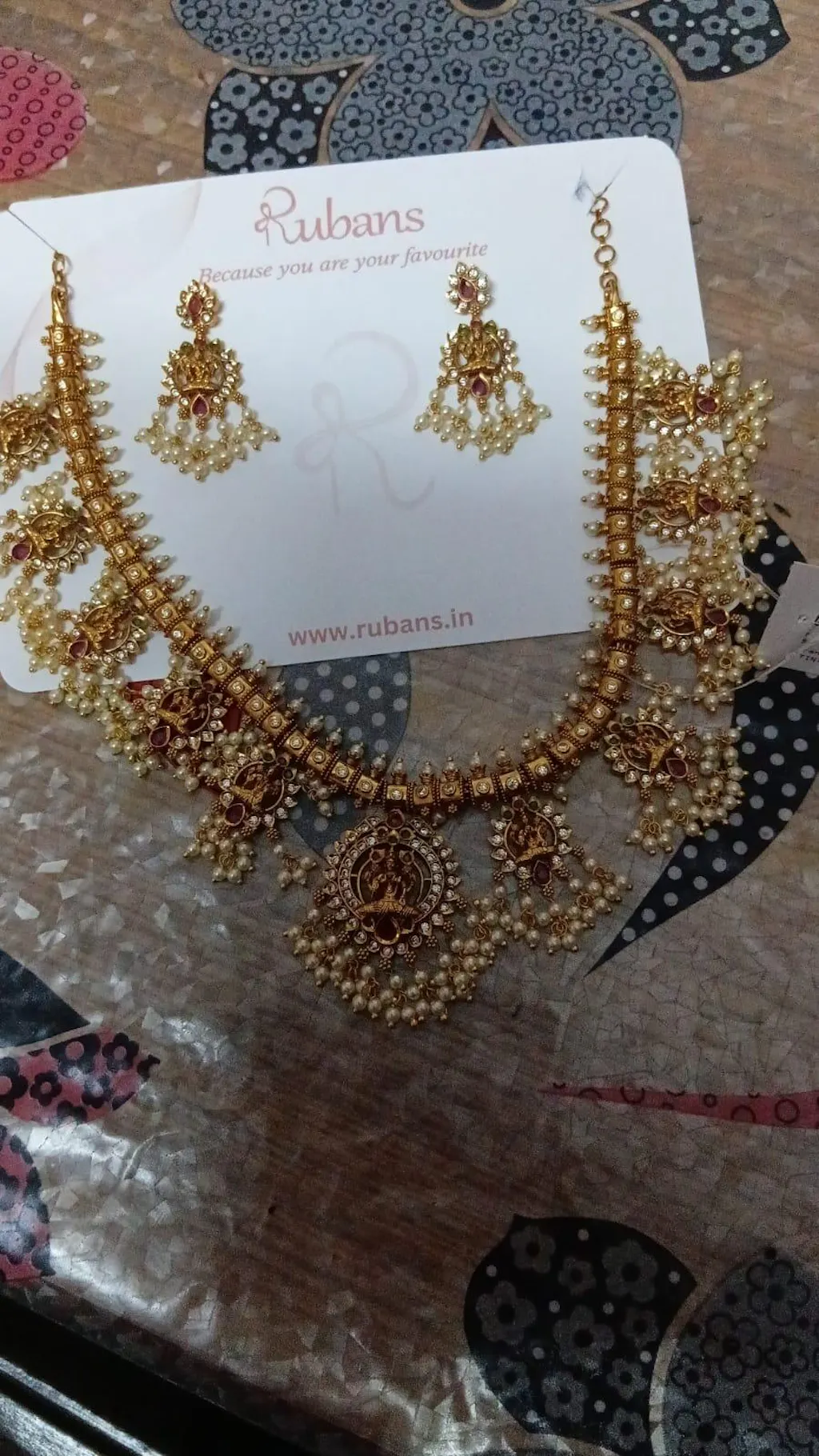 Jewellery Set : Celebrate tradition with this 24K gold-plated temple necklace set, adorned with intricate Lakshmi motifs, ruby stones, and delicate pearls for a grand festive look.