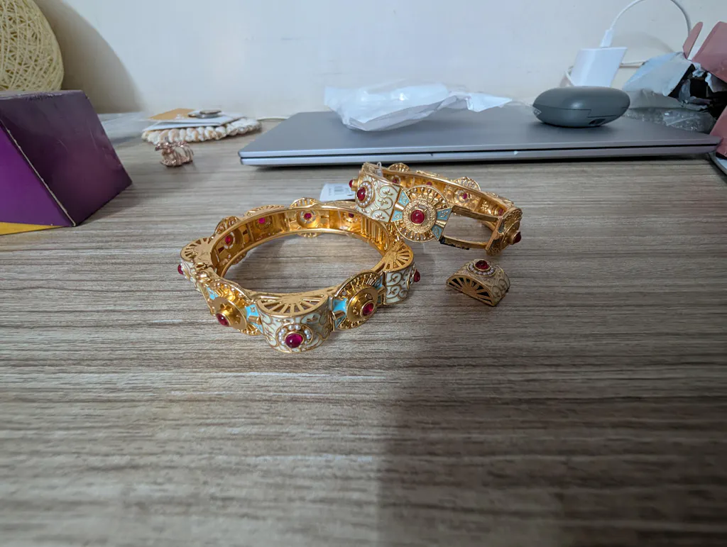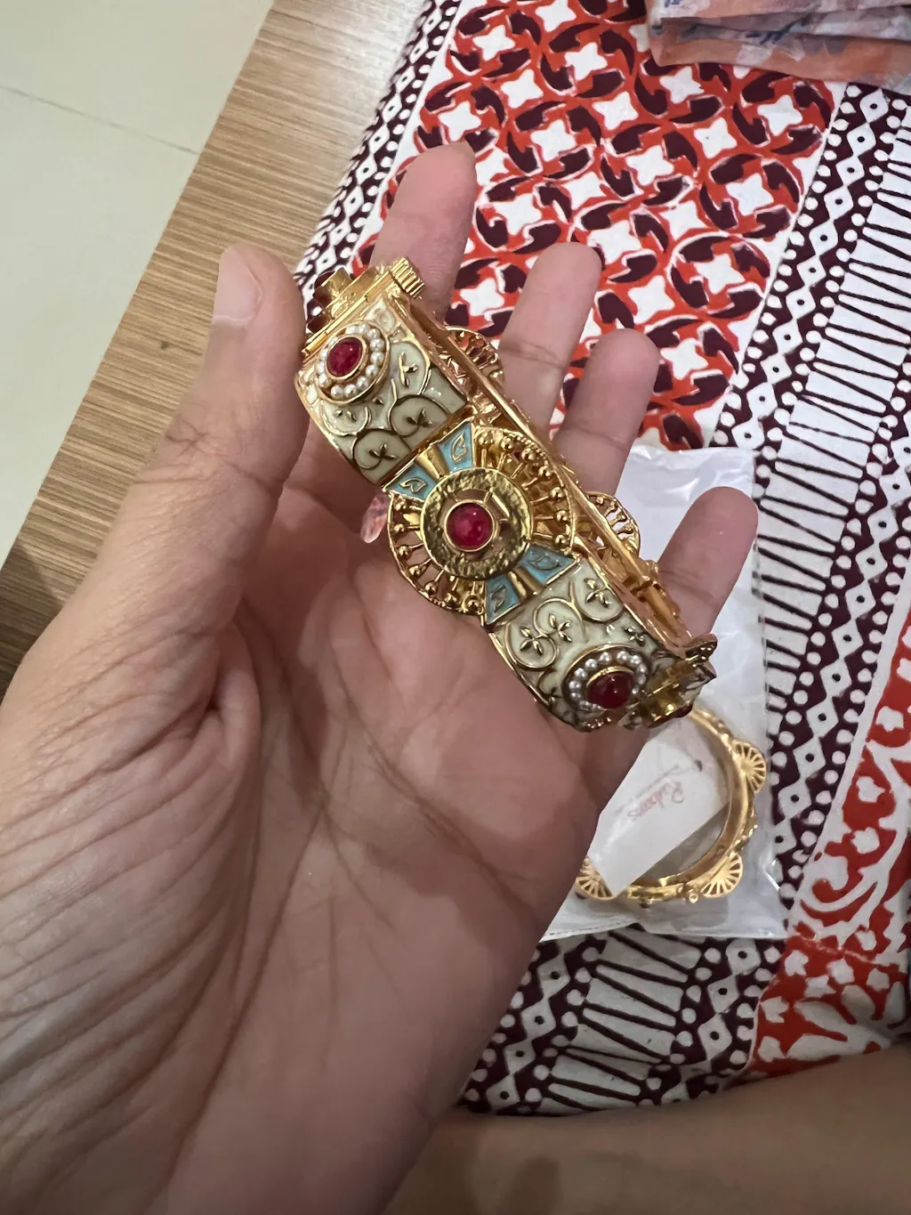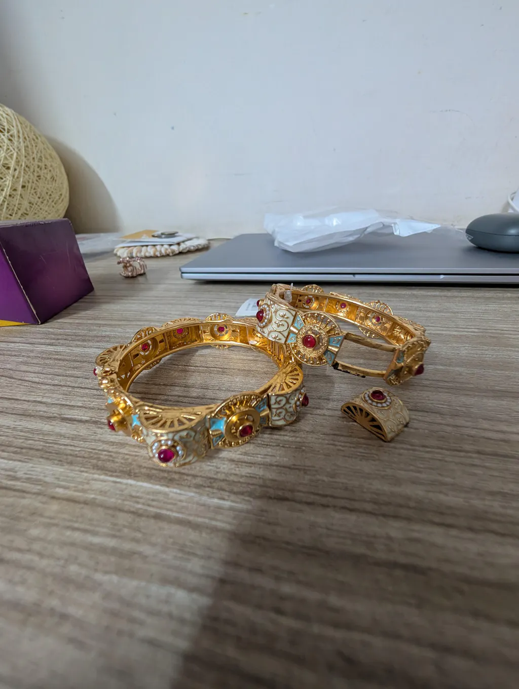 This exquisite set of 2 handcrafted bangles features a 22K gold-plated finish with intricate traditional patterns. Adorned with vibrant red stones, pearl accents, and detailed blue and peach enamel work, these bangles are a perfect blend of elegance and cultural heritage, making them a timeless addition to your jewelry collection.