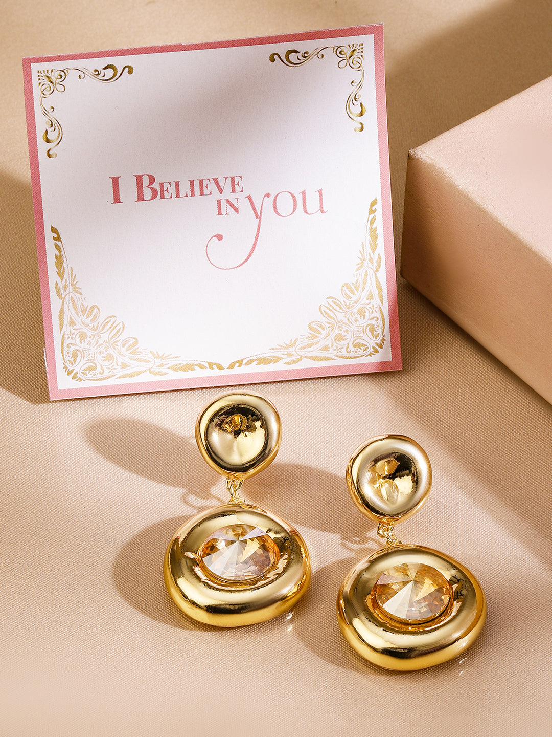 Earrings: Elevate your look with these Rubans 18K gold-plated drop earrings, featuring bold circular shapes and sparkling yellow crystal stones for a luxurious and chic statement.