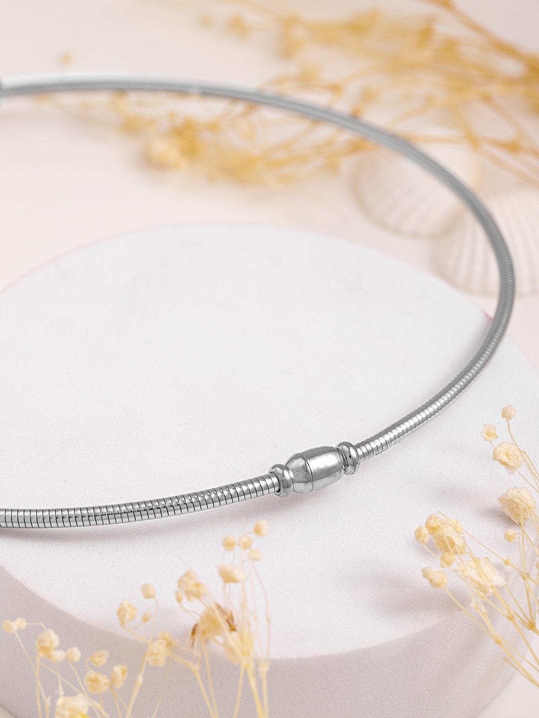 This sleek and elegant silver-plated stainless steel choker necklace features a minimalist curved bar design. Tarnish-free and waterproof, it ensures long-lasting brilliance and effortless style.