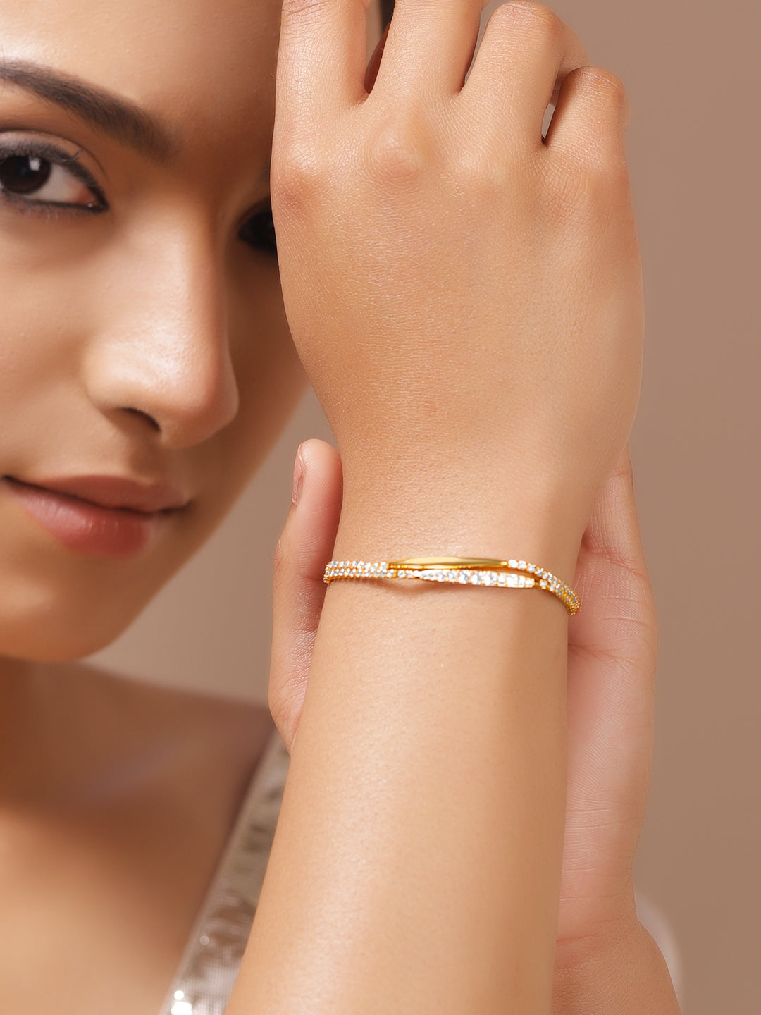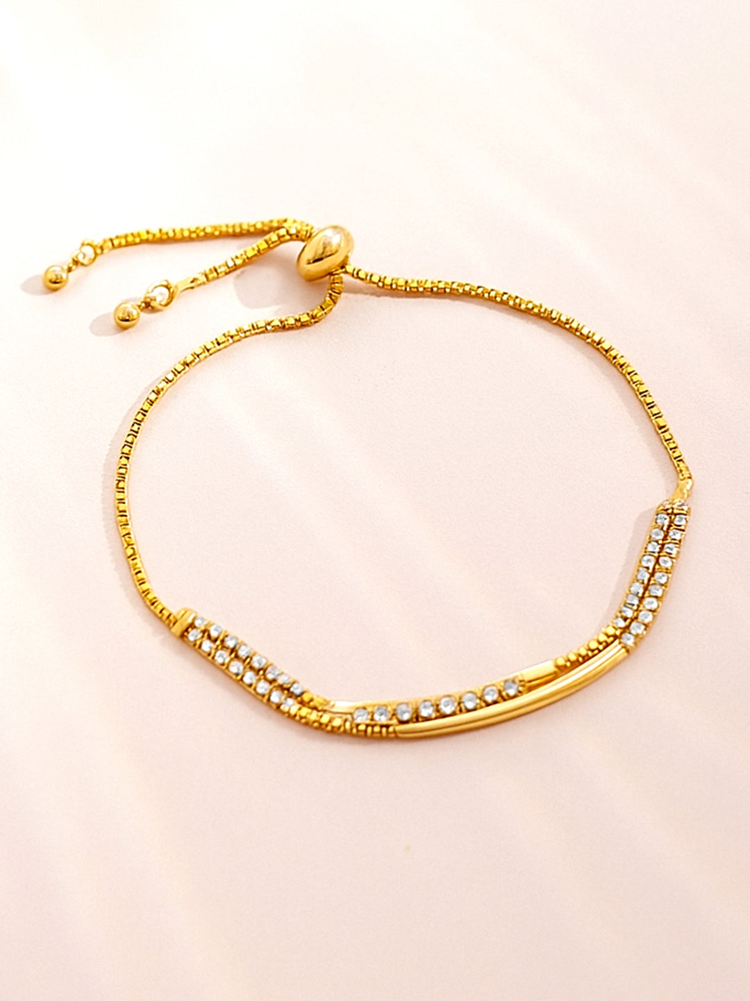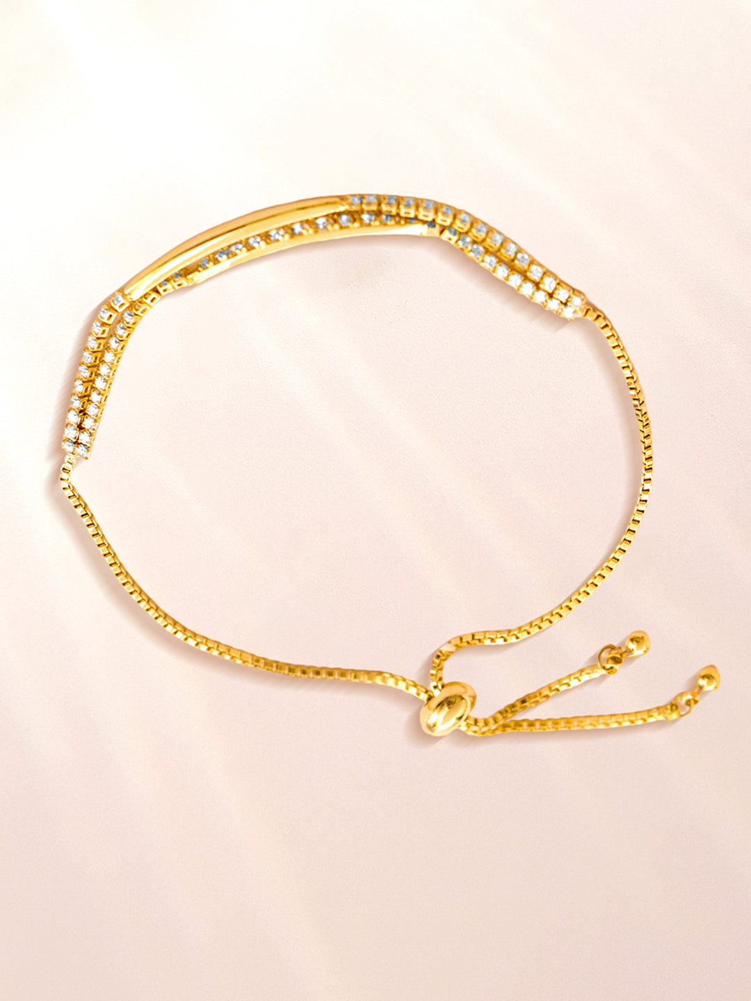 Rubans 18K gold-plated brass adjustable bracelet adorned with sparkling Cubic Zirconia stones. Sleek, minimal, and perfect for both everyday elegance and festive charm.