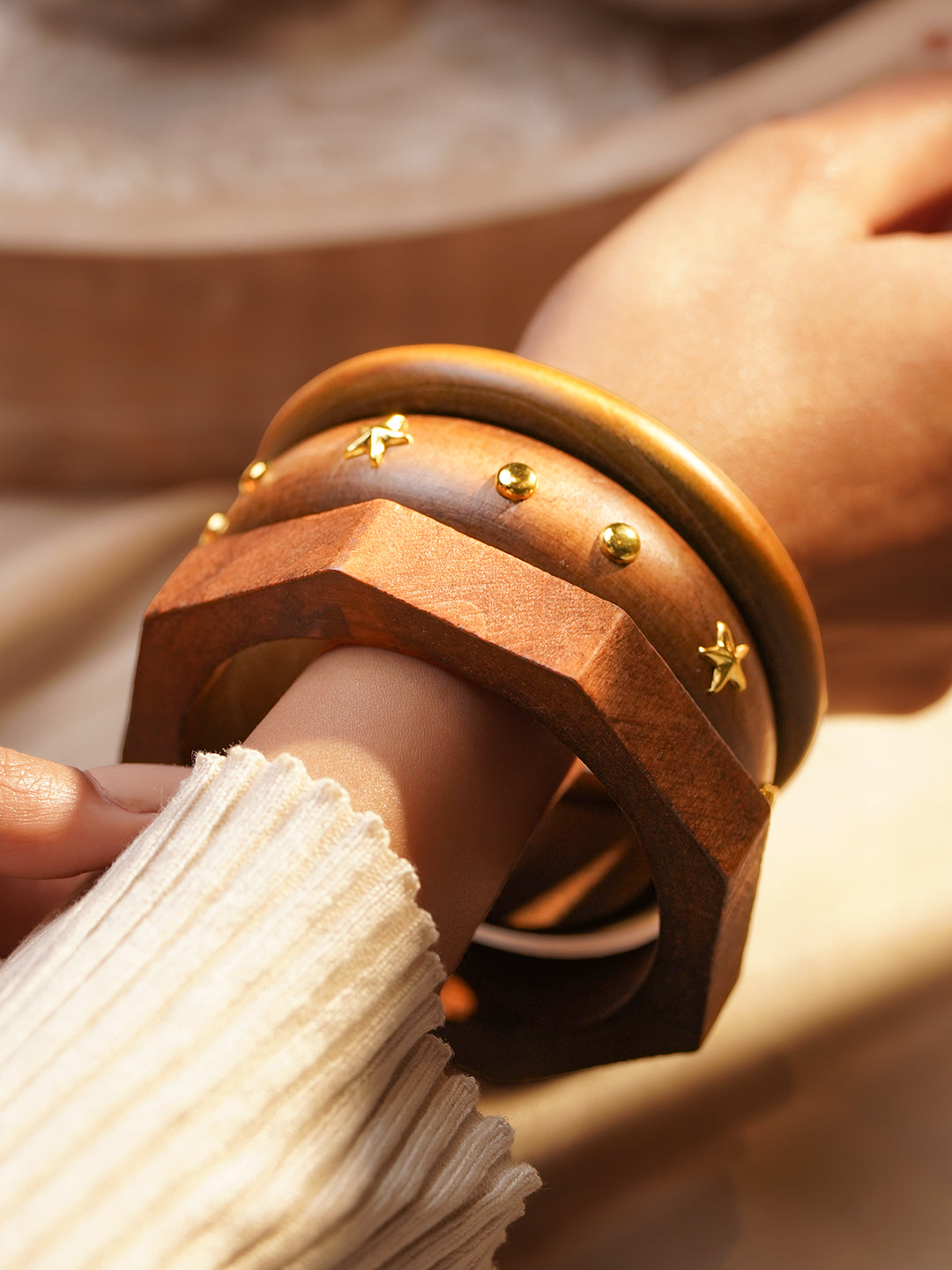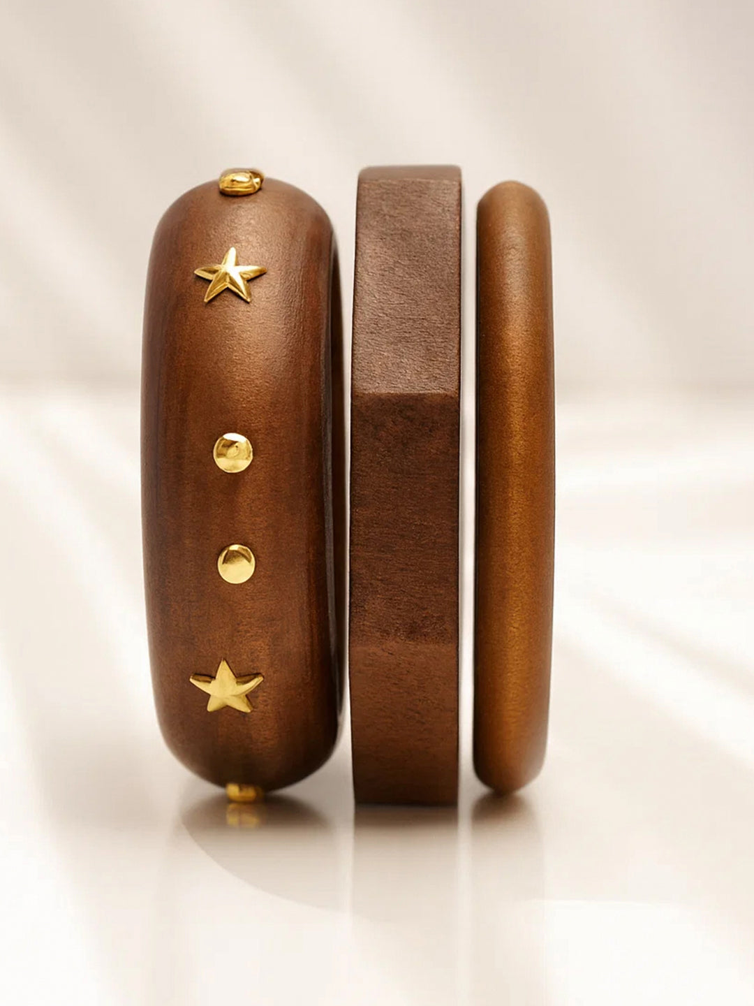 Crafted in smooth resin, this set of three bangle style bracelets features coffee brown and dark brown tones with studded detailing, offering a bold layered look with lightweight comfort for western styling.