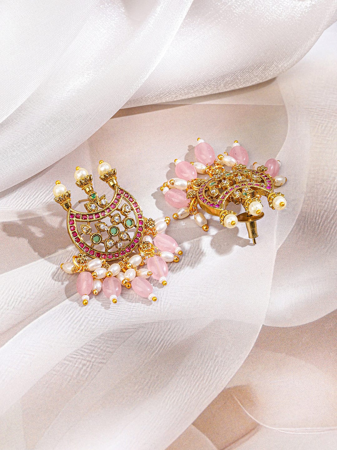 This 22K gold-plated handcrafted necklace set features a crescent-shaped pendant with mint green and ruby pink stones, pastel pink beaded drops, and matching earrings—perfect for festive and bridal looks for women & girls.