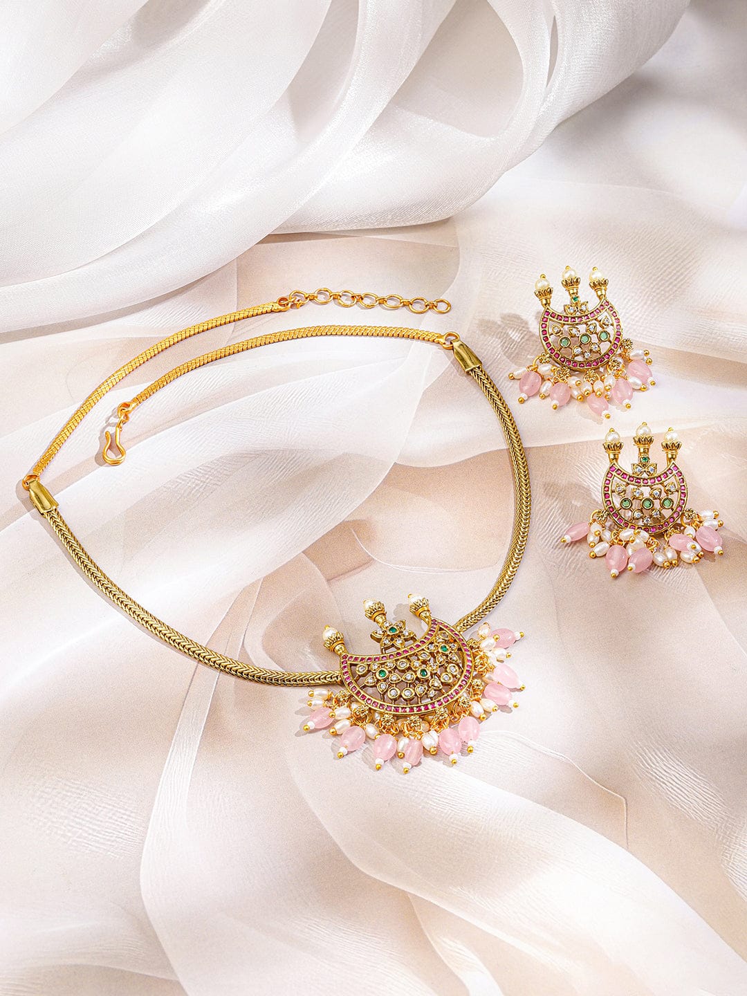 Rubans 22K Gold-Plated Mint Green Ruby Pink Stone & Pastel Pink Beaded Handcrafted Crescent Necklace Set for Women Jewellery Set