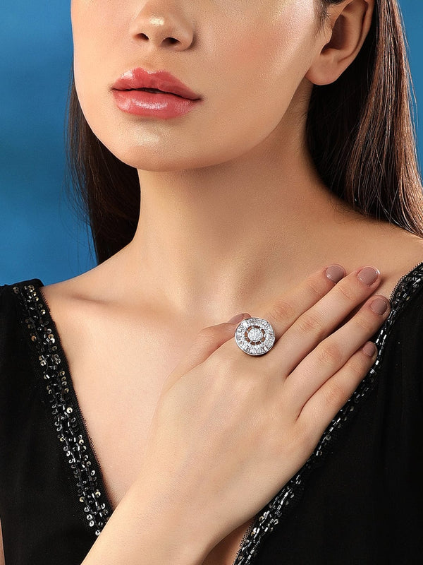 Rubans Rhodium Plated Baguette & Pave Zircons Studded Statement Adjustable Ring