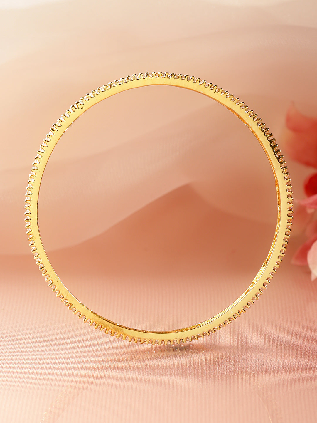This 18K gold-plated brass bangle set of 4 sparkles with Cubic Zirconia stones, exuding timeless grace for daily wear, festive gatherings, and elegant celebrations.
