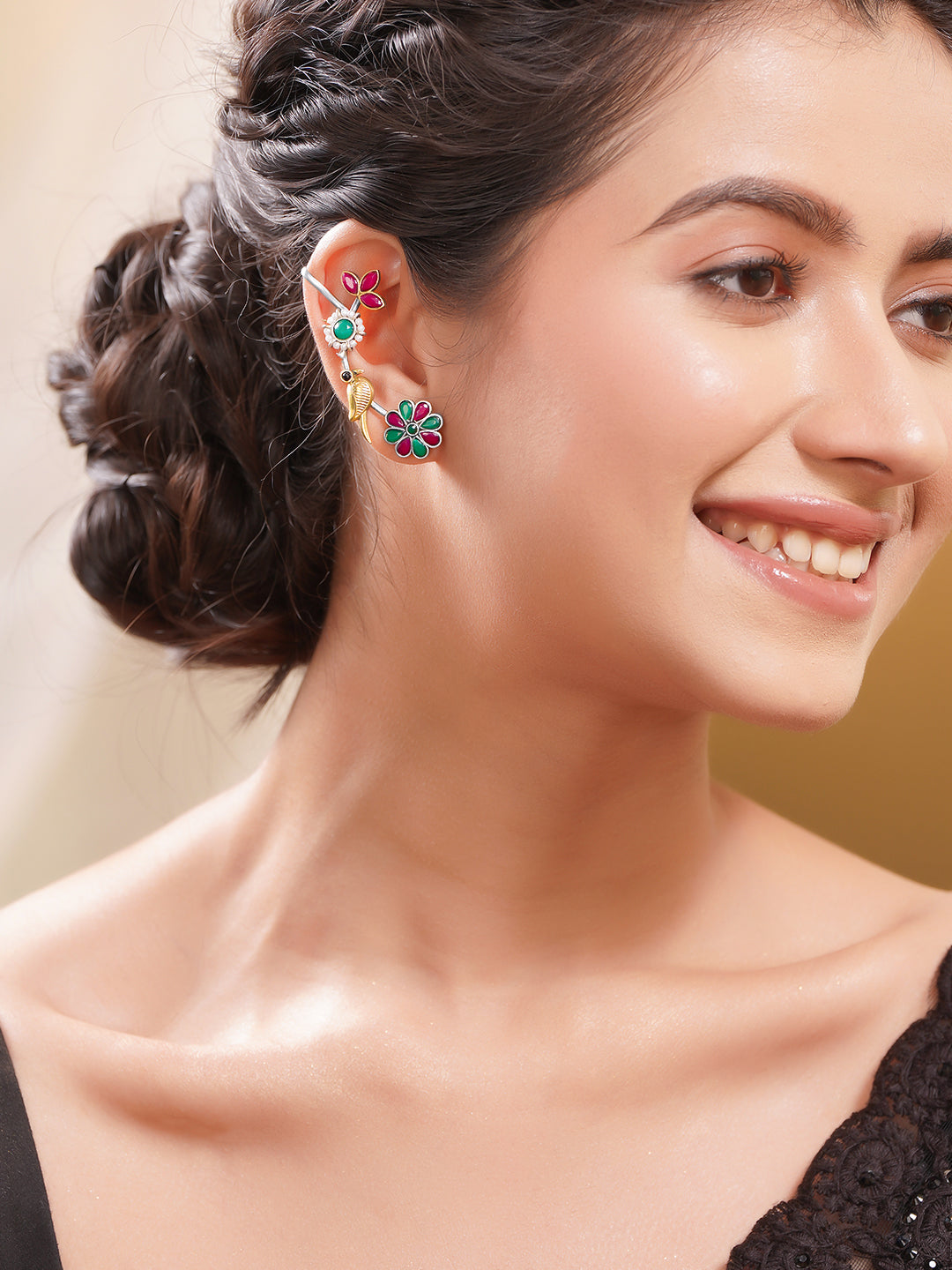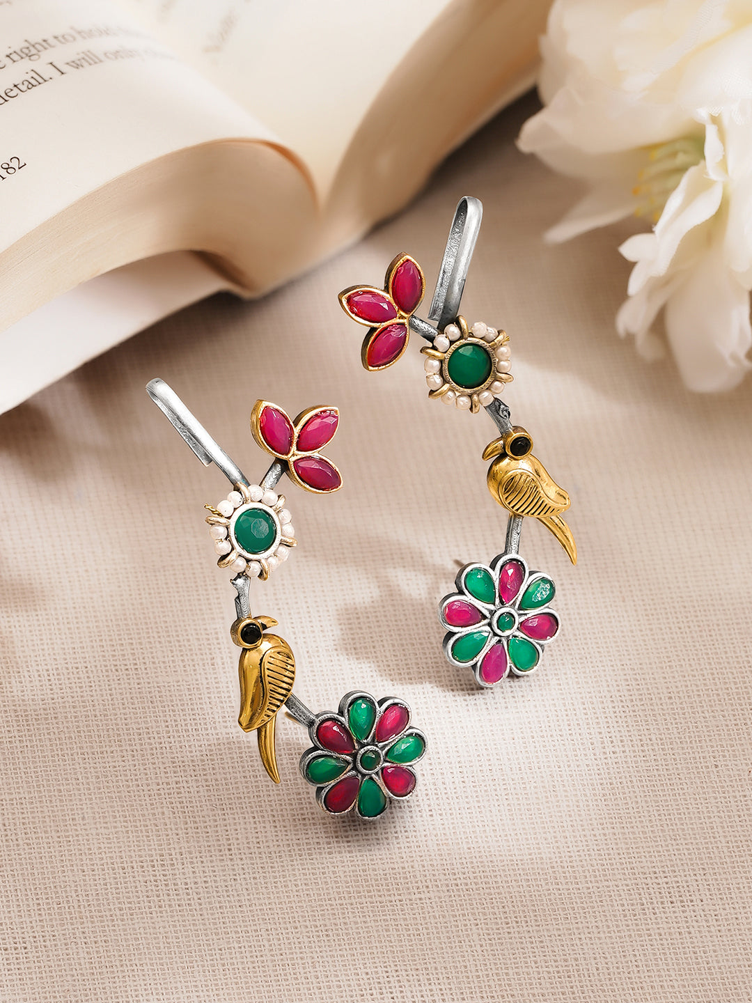 Crafted in oxidised silver tone brass, this glass kundan multicolor floral bird motif statement ear cuff jewellery adds festive elegance and trendy appeal, making it a perfect fashion jewellery pick and thoughtful gift jewellery for women.