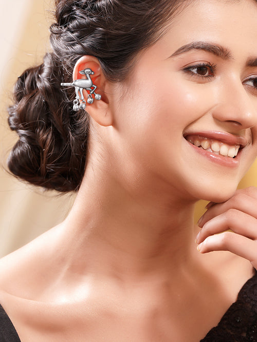 Crafted in oxidised silver tone brass, this bird motif ear cuff features delicate ghungroo detailing for a bold ethnic look. A statement jewellery piece perfect as festive jewellery, trendy jewellery for women, and elegant gift jewellery.