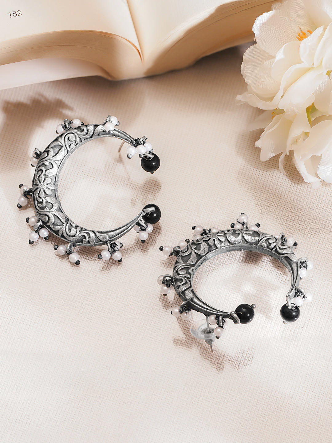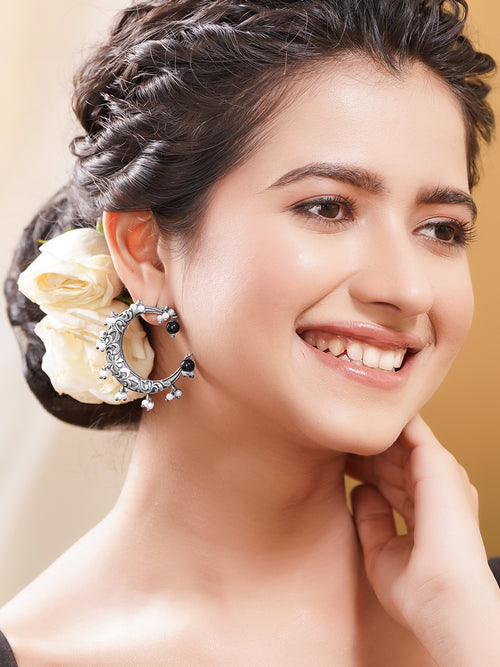 Crafted in oxidised silver tone brass, these crescent hoop earrings feature engraved detailing with delicate bead accents, making them a perfect statement jewellery choice for festive looks, ethnic styling and elegant gift jewellery for women.