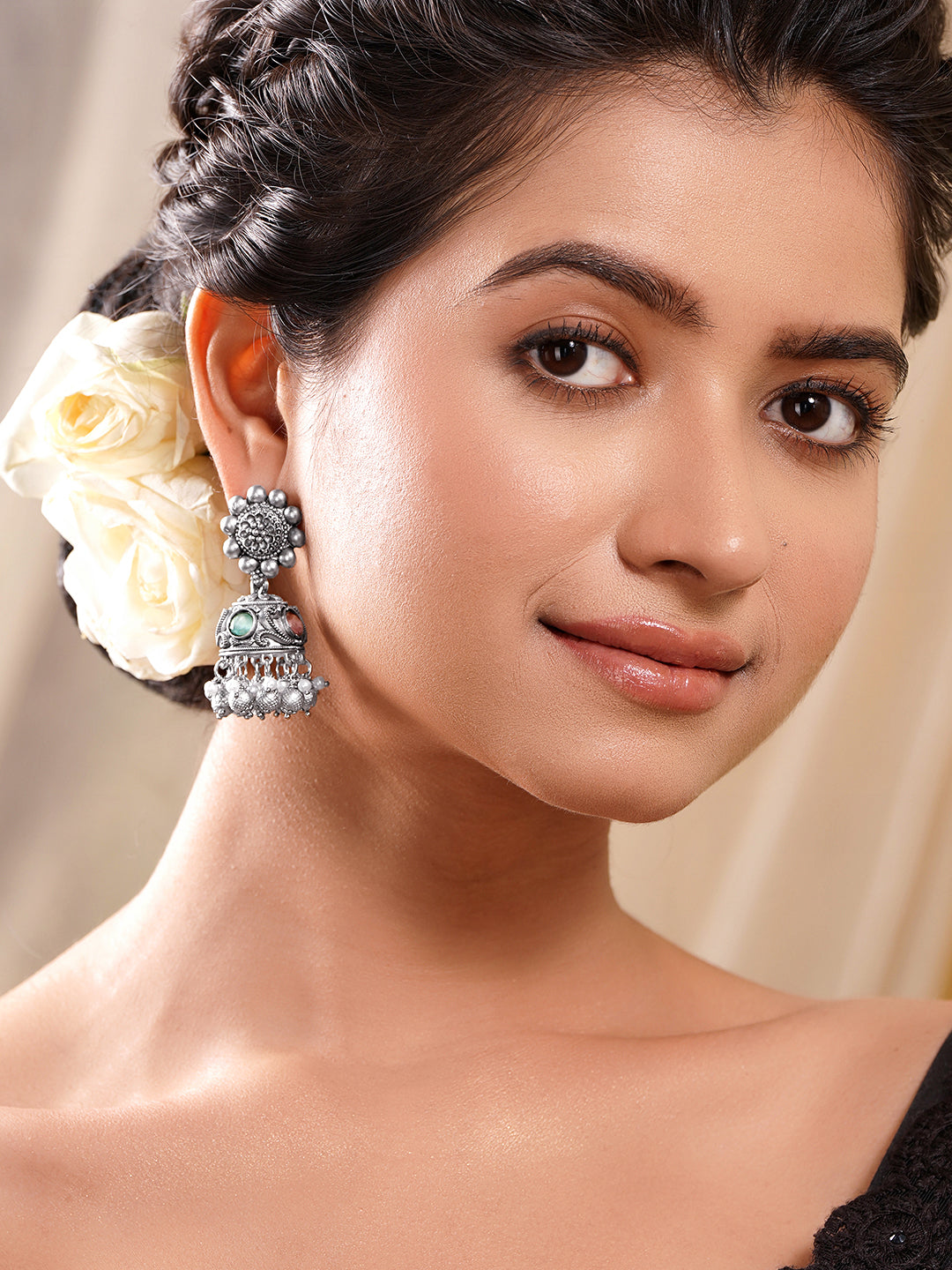 Inspired by heritage craftsmanship this oxidised jhumka features floral detailing ghungroo accents and pearl drops. A timeless piece designed to bring elegance confidence and tradition into everyday festive styling.