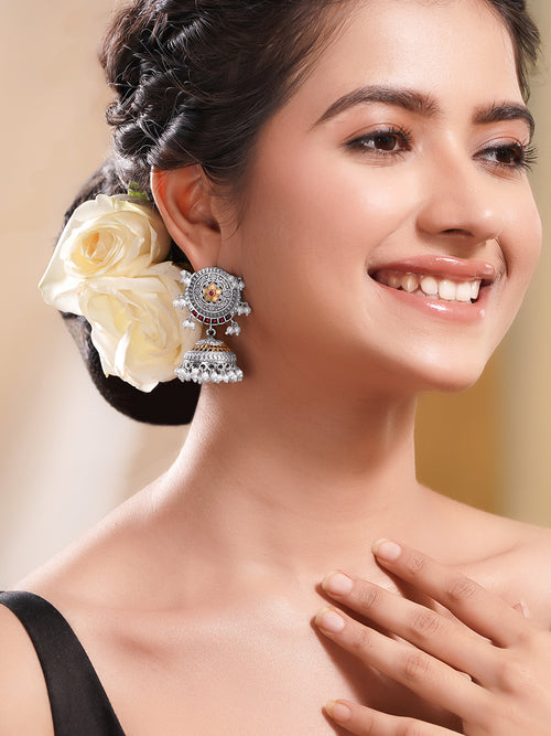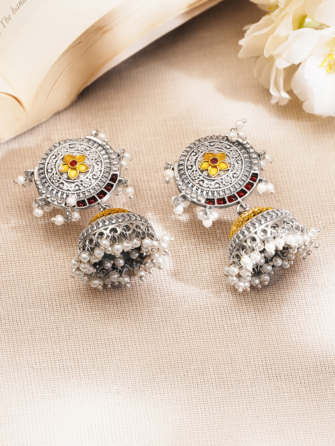 Crafted in oxidised silver tone brass, these artistic jhumka earrings feature a circular engraved motif with gold tone floral detailing and white pearl hangings, delivering statement depth with traditional finish.