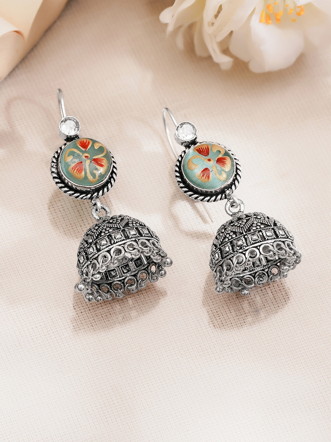 Crafted in oxidised silver tone brass with multicolor hand enamel floral detailing and white accents this traditional jhumka design offers timeless charm for festive styling and cultural occasions