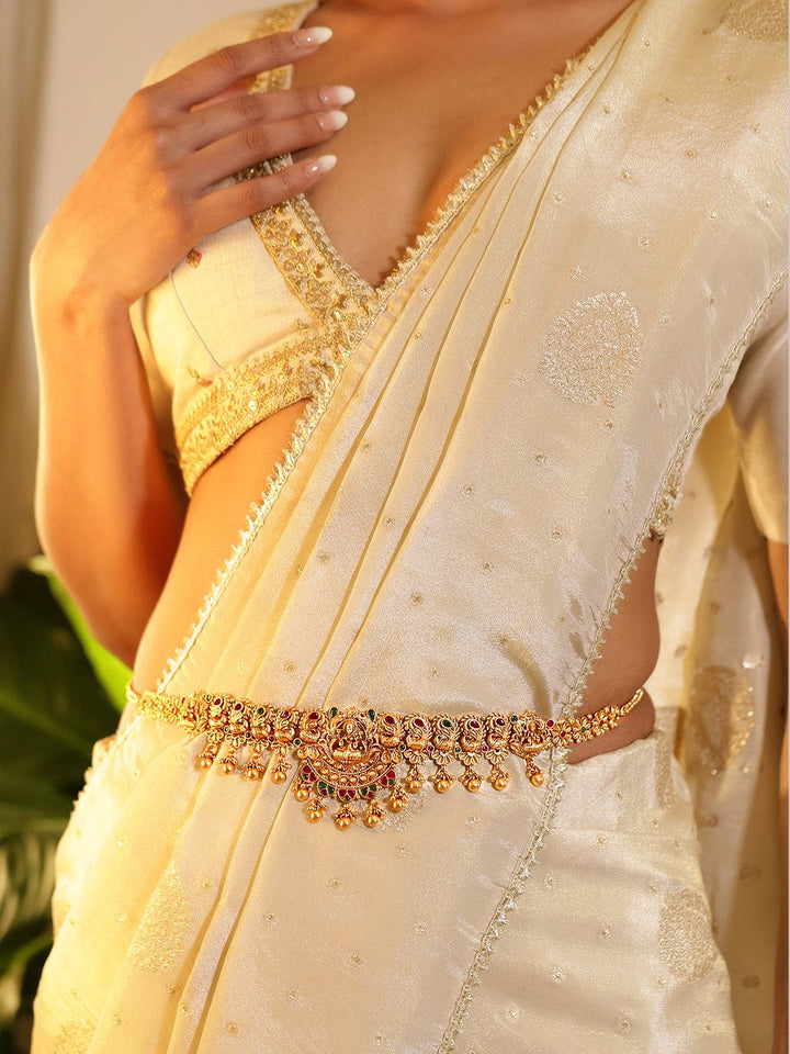 Saree Accessories : Elevate your traditional look with this Rubans 18K gold-plated kamarbandh. Featuring a delicate arrangement of ruby red and emerald green stones, this handcrafted piece is adorned with golden beads and intricate detailing. Perfect for enhancing ethnic and festive ensembles.