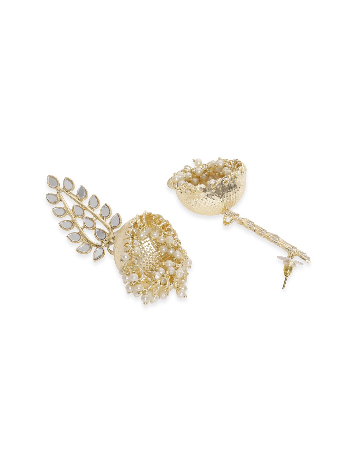 Elegant 18K gold plated traditional jhumka adorned with mirror studs and pearl beads. Perfectly crafted for a sophisticated and timeless look.