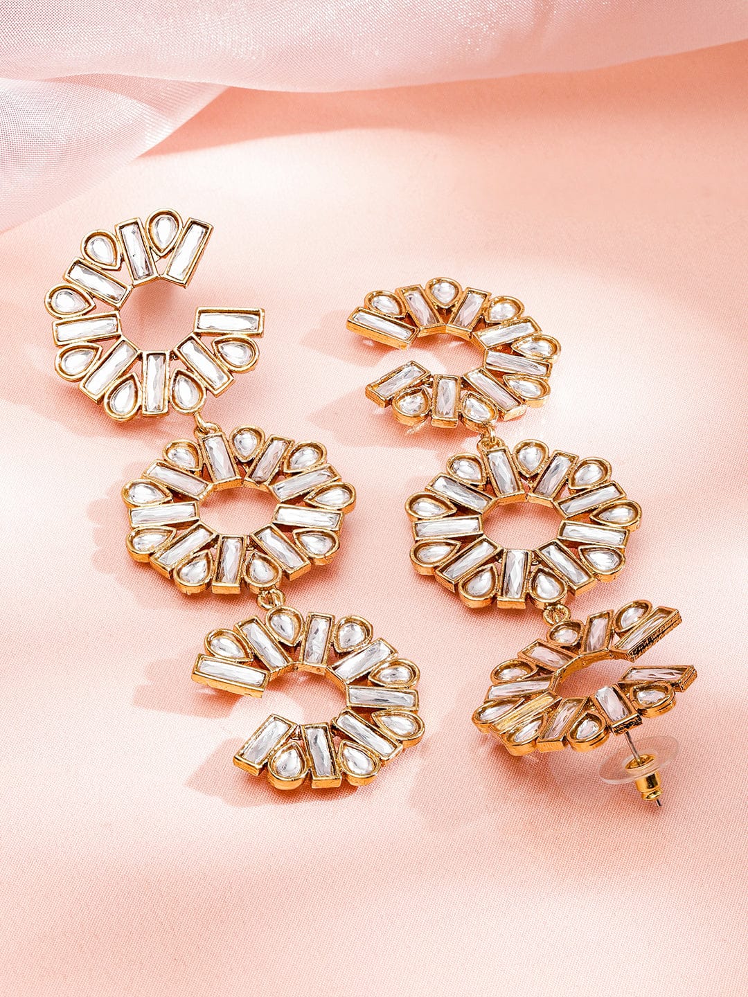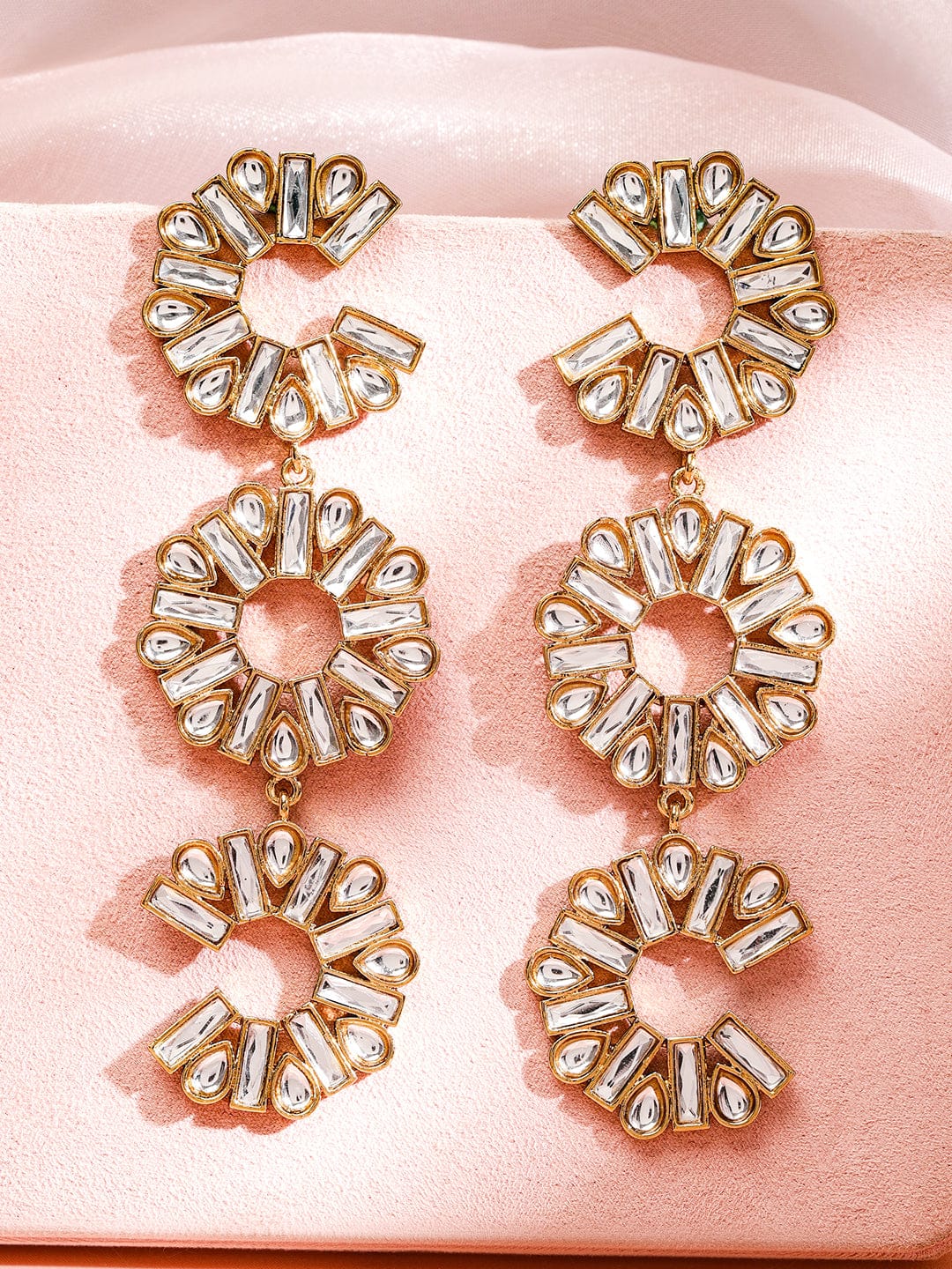Earrings : Rubans 22K Gold-Plated Triple Drop Shoulder Duster Earrings with white crystal AD stones, bold longline design, and premium brass base. Perfect statement jewellery for parties, cocktails & festive occasions.