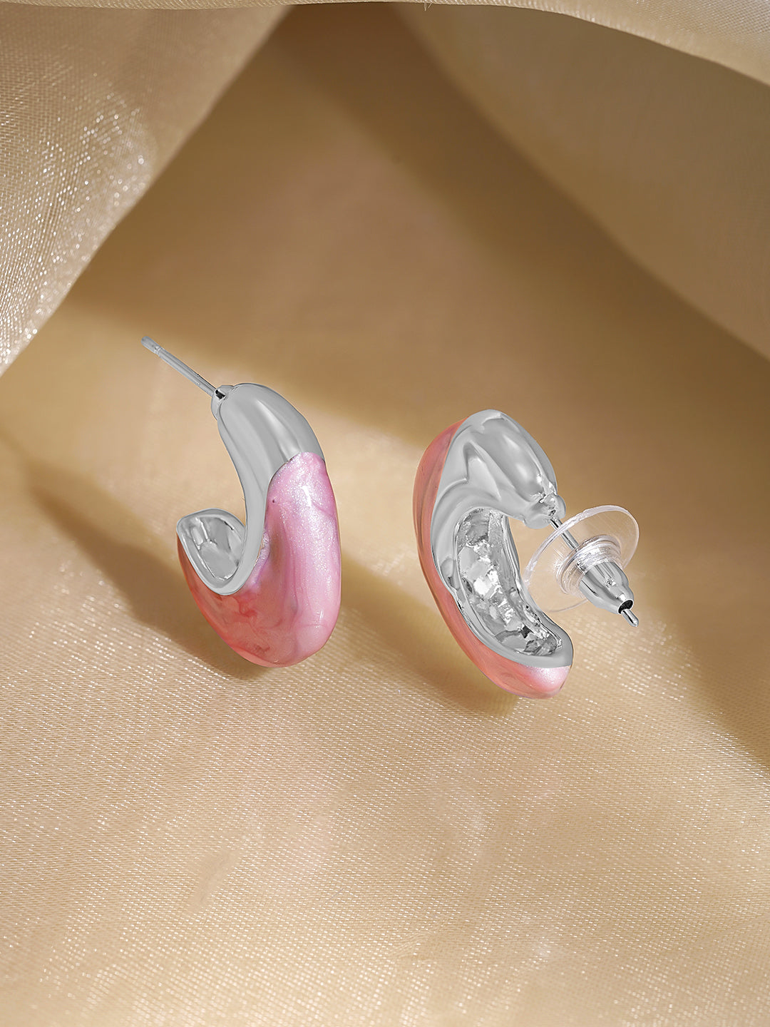 Rhodium-plated brass hoops with a soft pink enamel finish, featuring a minimal curved design perfect for daily, office, and modern casual styling.