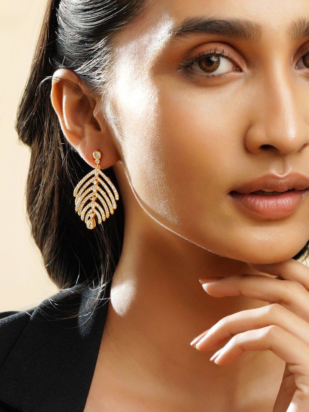 22K gold-plated Rubans drop earrings adorned with sparkling Cubic Zirconia in a layered leaf silhouette, perfect for party, festive, cocktail and wedding-ready looks.