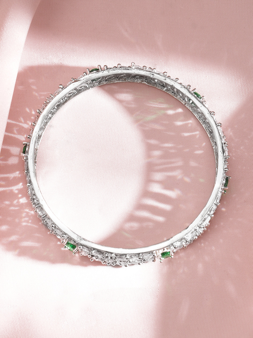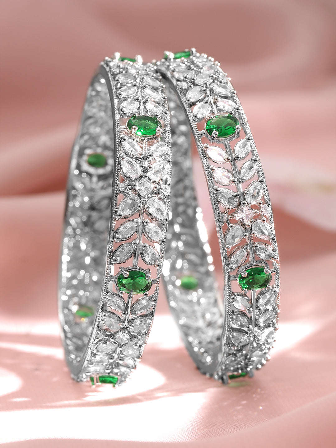 Set of 2 Rhodium-Plated Emerald Green Gemstone & Cubic Zirconia Studded Bangles